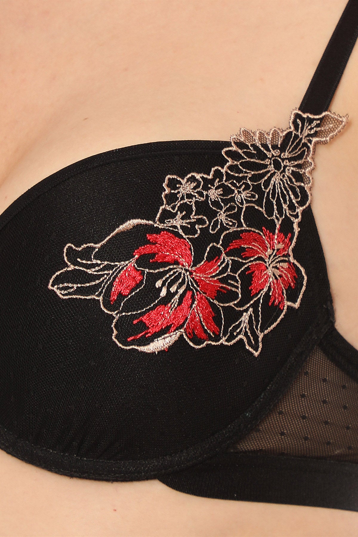 Sutien push-up din colecția Tasmine, realizat din tulle fin decorat cu broderie florală, oferă volum și un decolteu spectaculos. Perfect pentru a adăuga un plus de rafinament și feminitate.