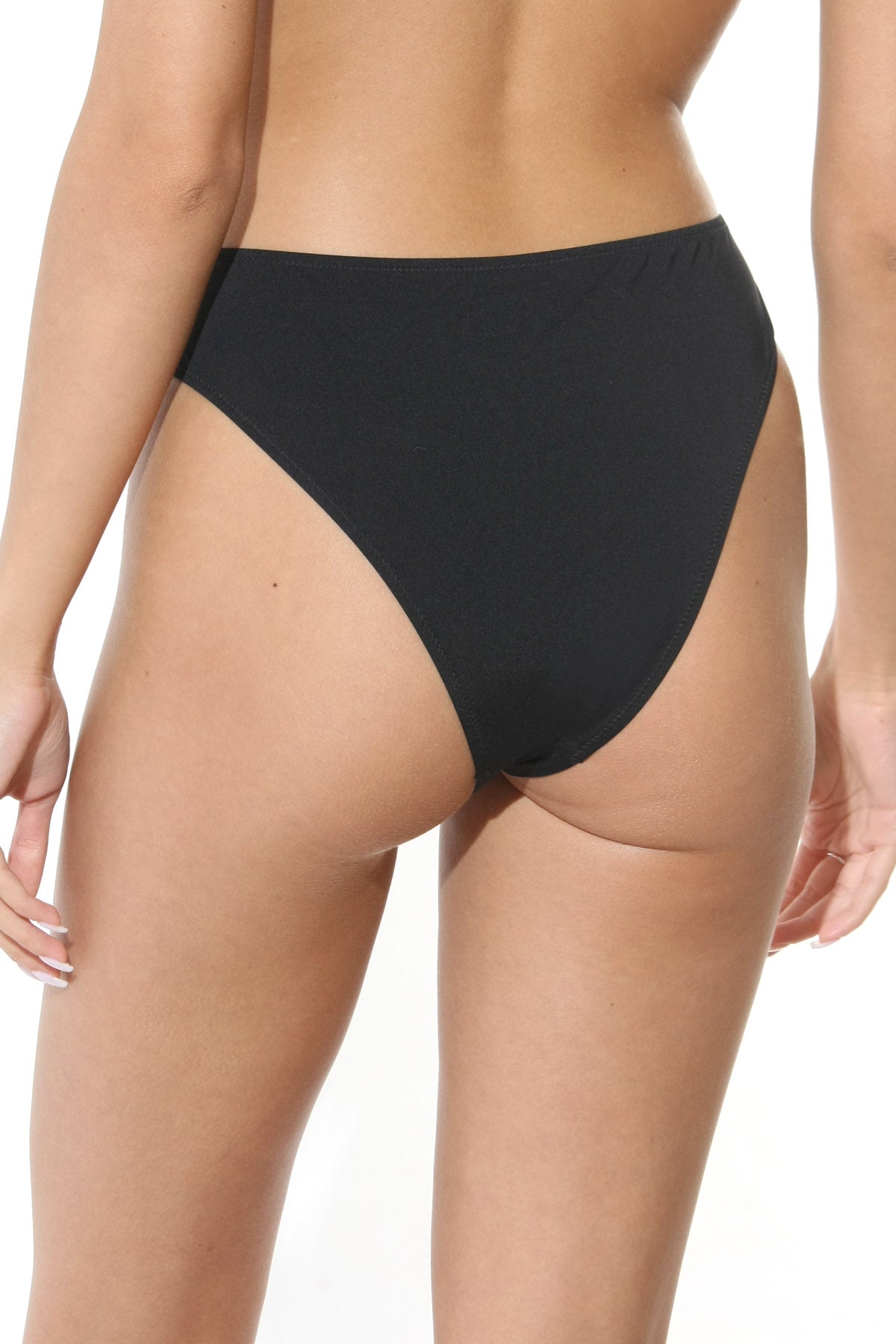 Slip de baie cu croială brazilian și talie înaltă, într-o nuanță clasică de negru – o alegere îndrăzneață și feminină, ideală pentru un bronz uniform.