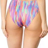 Slipul de baie clasic din colecția ALEGRE, cu talie medie, este realizat din microfibră reciclată, cu țesătură jacquard și model abstract multicolor – o alegere modernă pentru zilele însorite la plajă sau piscină.