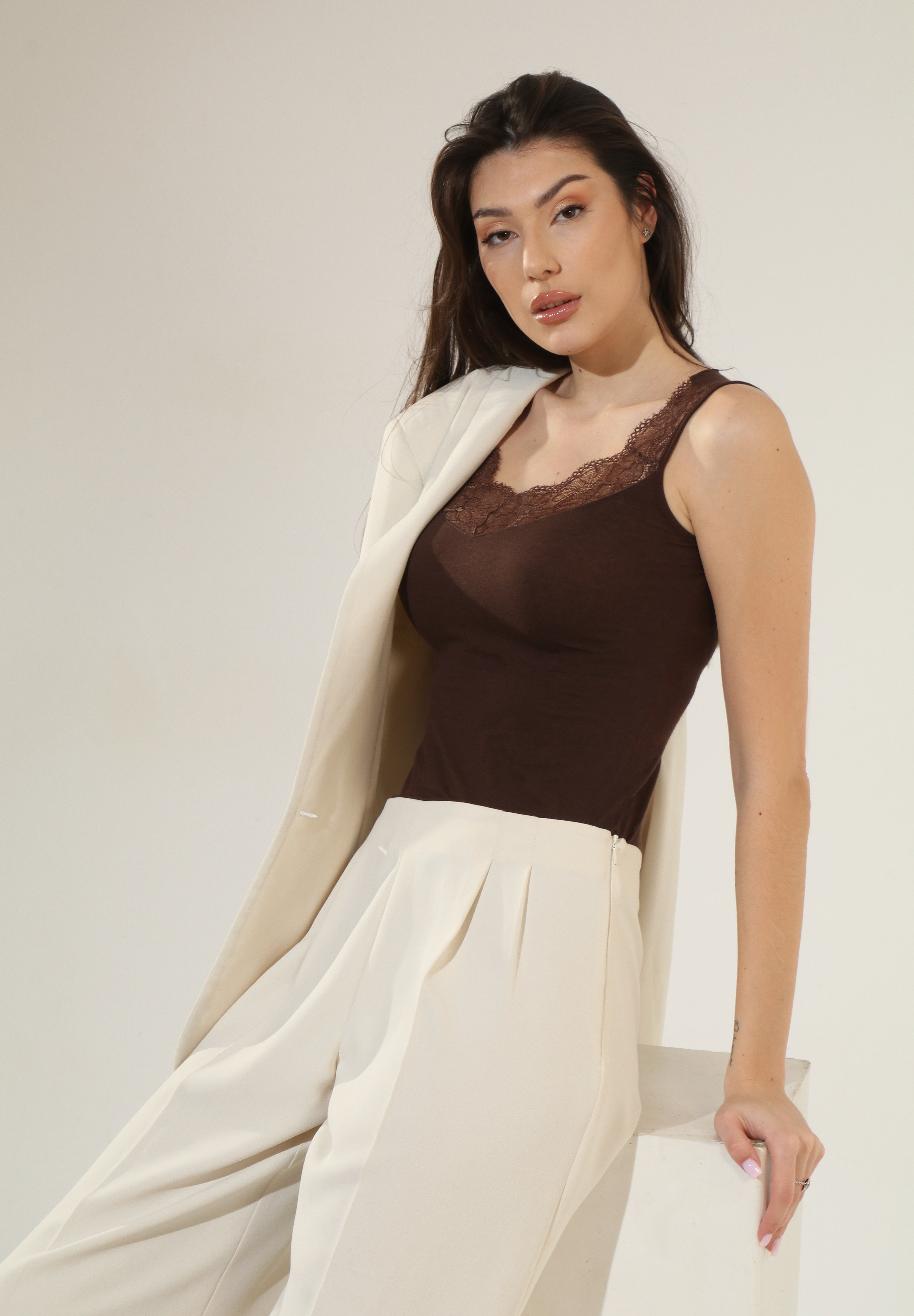 Maiou cu cașmir și modal, ce se mulează delicat pe corp, iar dantela adaugă o notă romantică și elegantă.